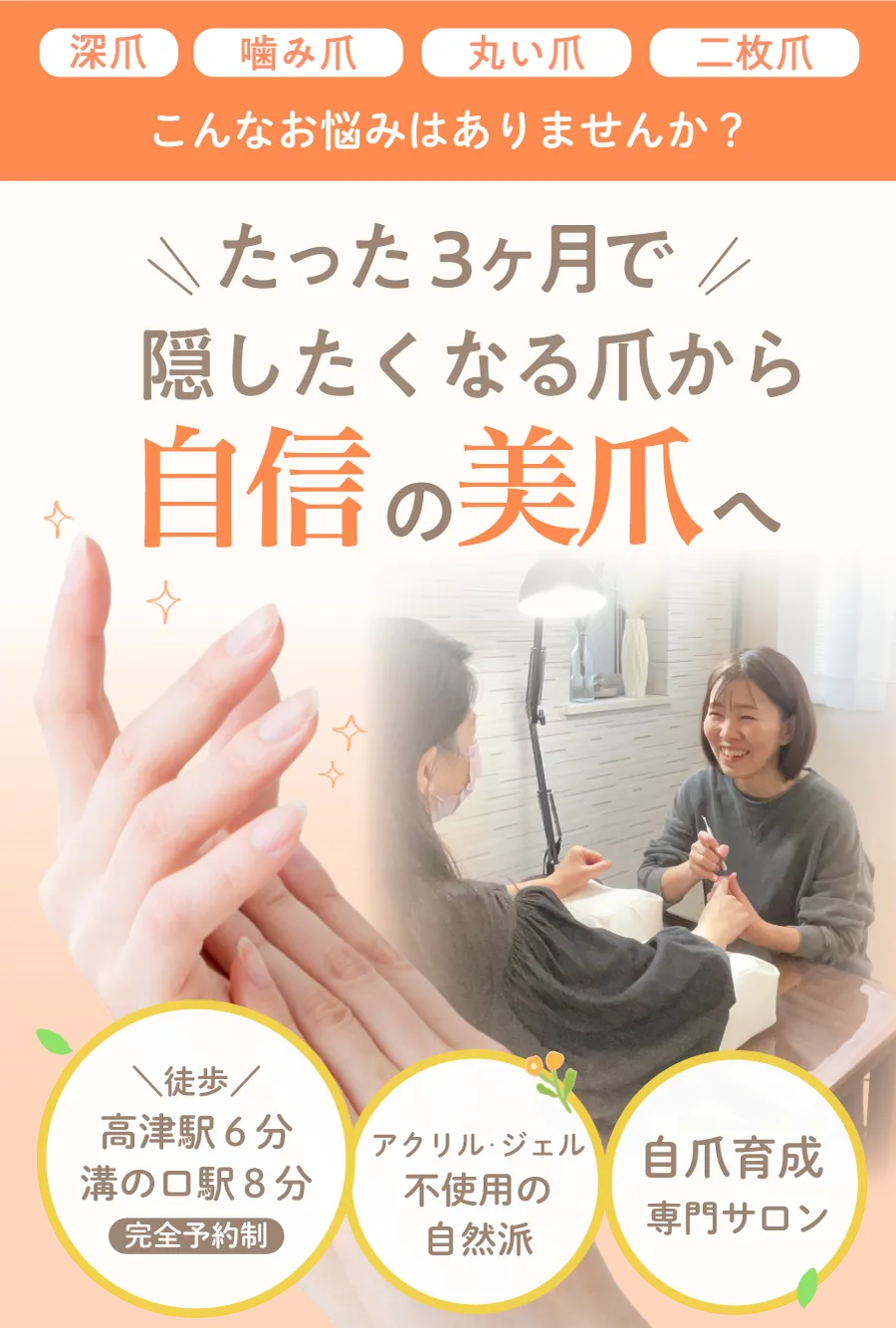 深爪、丸爪、噛み爪、むしり爪、ジェルネイルで傷んだ爪にお悩みの方へ。自爪育成ネイルケアは、爪本来の健やかな成長をサポートし、自然な美しさを取り戻すお手伝いをしています。