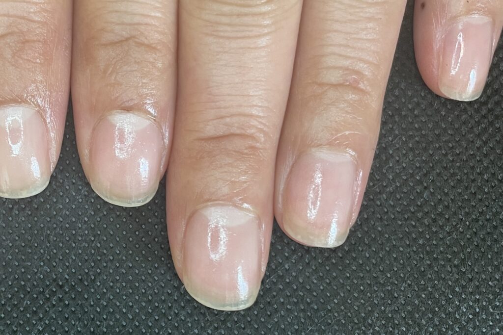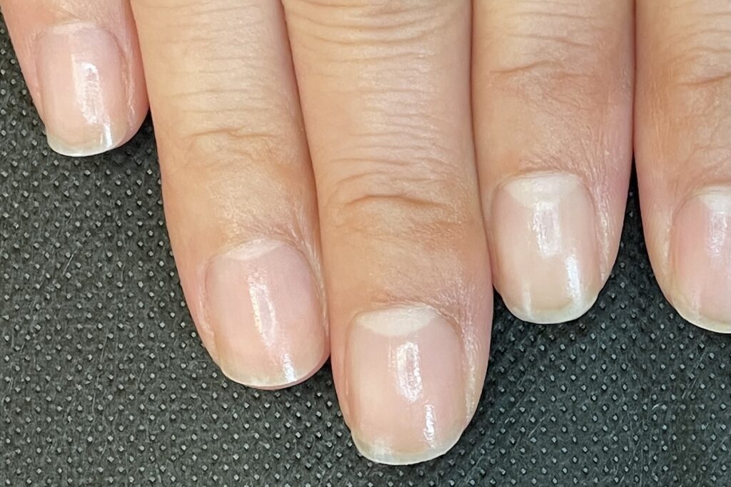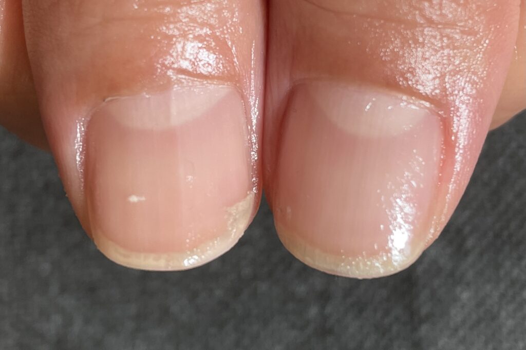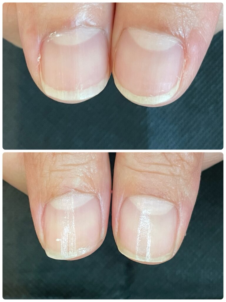 コース開始から3ヶ月頃になると、根元からは新しく強い爪が生えてきていますが、先端にはまだ育成前の「弱かった頃の爪」が残っています。