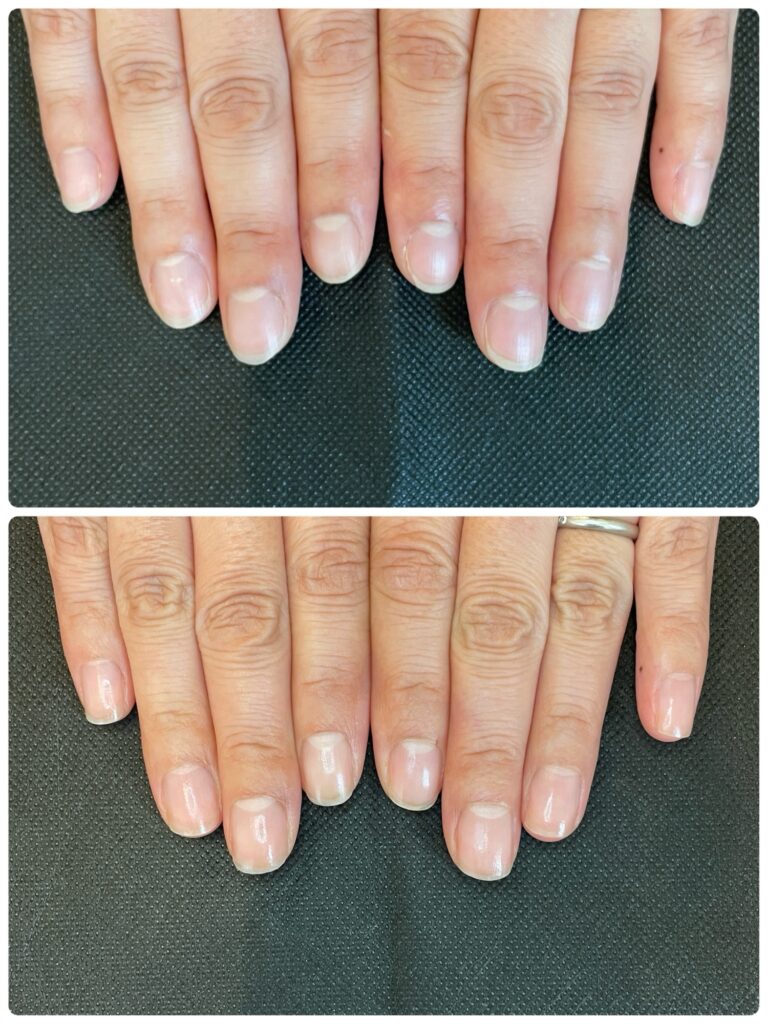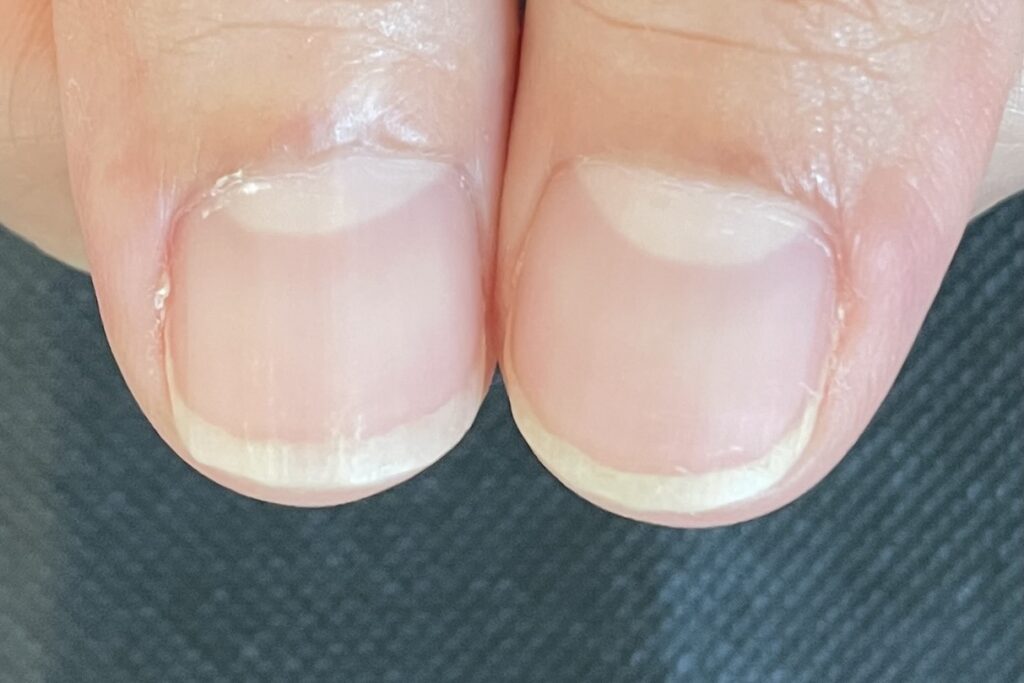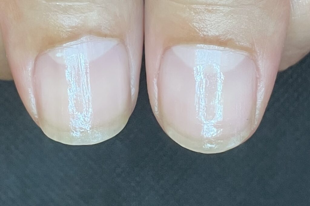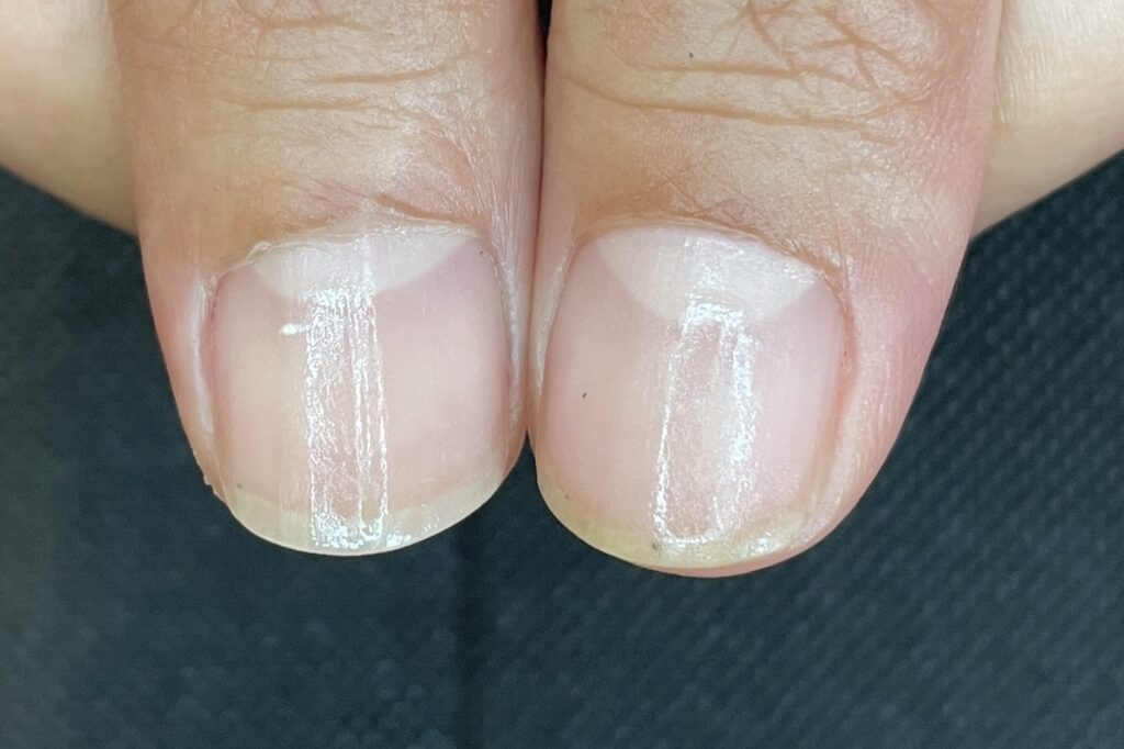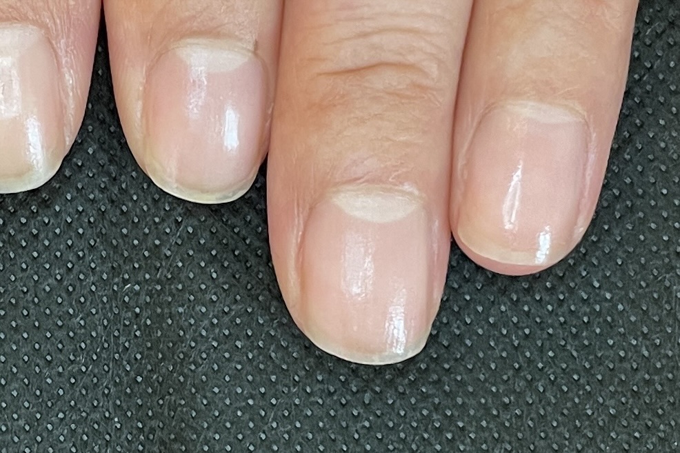 コース開始から3ヶ月頃になると、根元からは新しく強い爪が生えてきていますが、先端にはまだ育成前の「弱かった頃の爪」が残っています。
